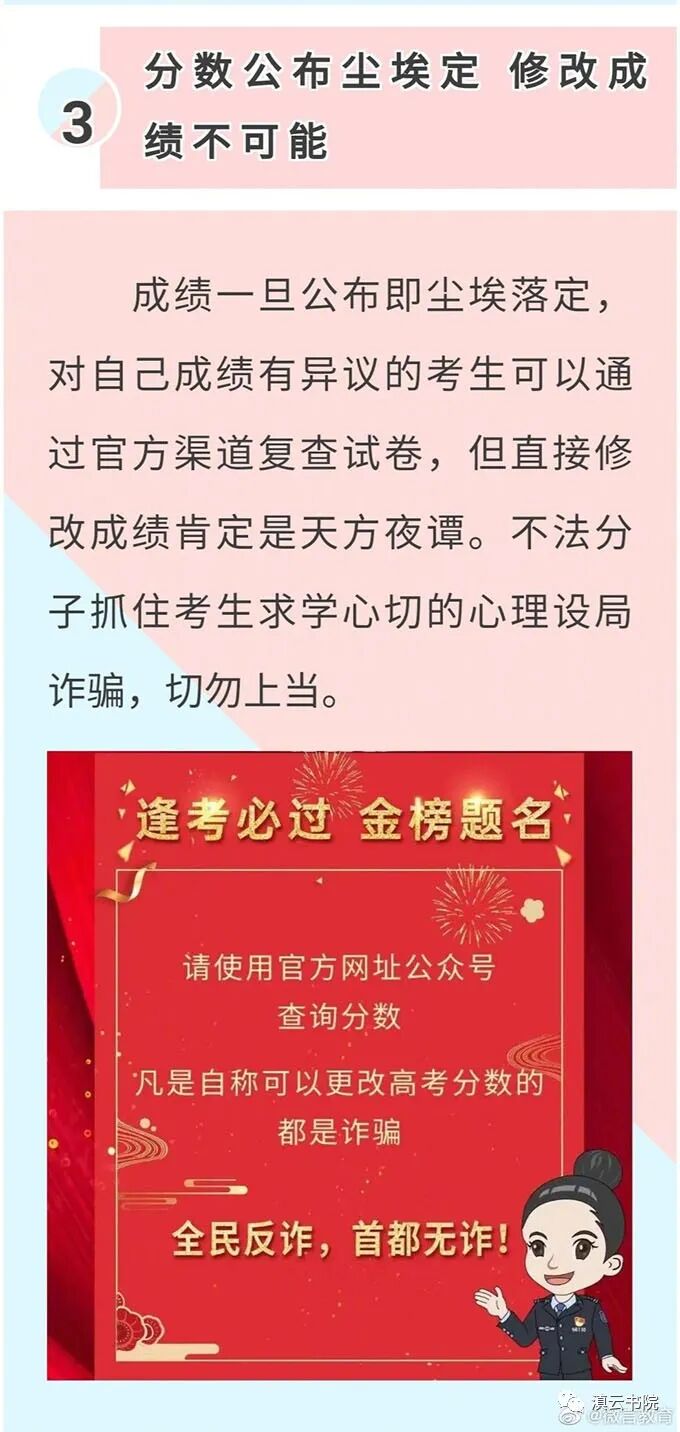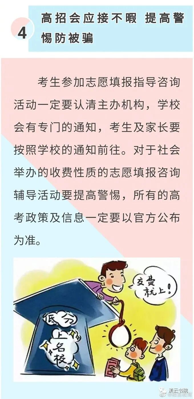 在此,滇云书院招生办新闻中心提醒广大考生和家长:贩卖大学“内部指标”、查分数链接是陷阱、复查试卷修改成绩、以助学金申请为由骗取个人信息……对这些高考之后的诈骗套路一定要多个心眼了,千万别中了圈套上当!